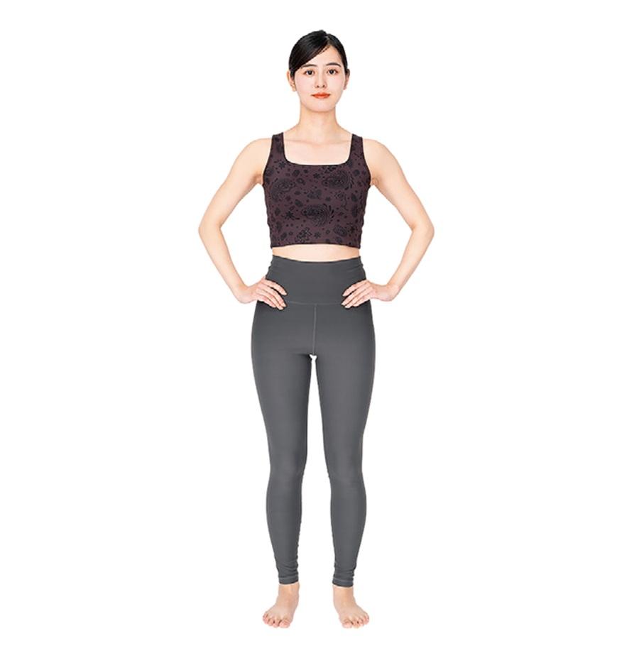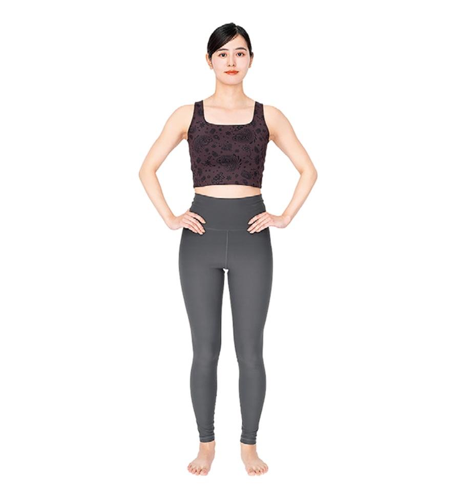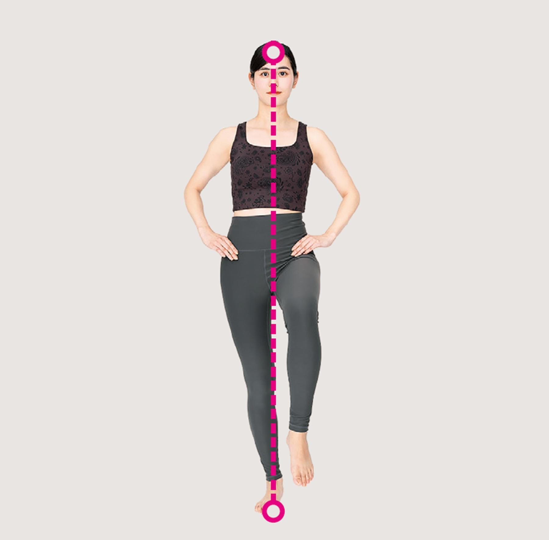【POINT】両足に均等に重さがかかるように立つと、左右の腰骨が同じ高さにくるようになる。