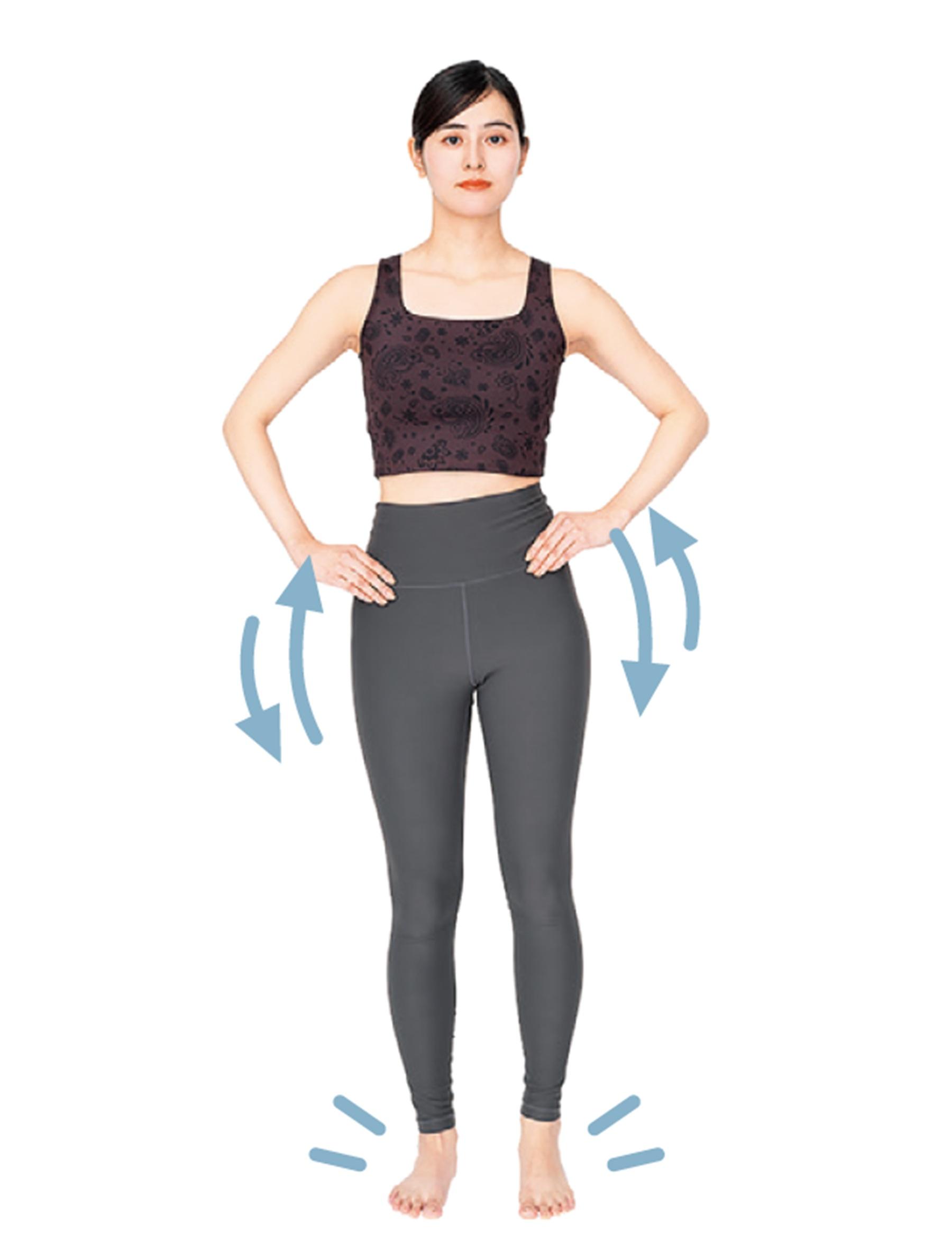 足は骨盤幅に開き、手は腰に。左右の足に体重を交互に乗せて、骨盤を小刻みに揺らす。左右の足への重さが均等になる位置を見つけたら脱力して立つ。
