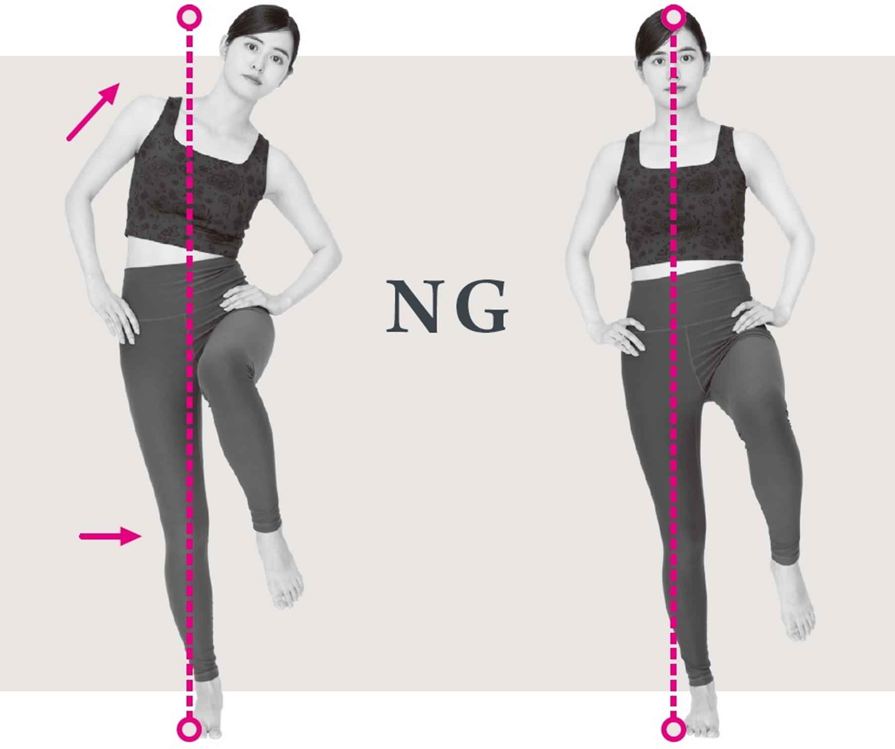 骨盤が上下に回転してずれていると、足が上げにくくなり、重心がぶれたり、膝が内側に向いてしまう。