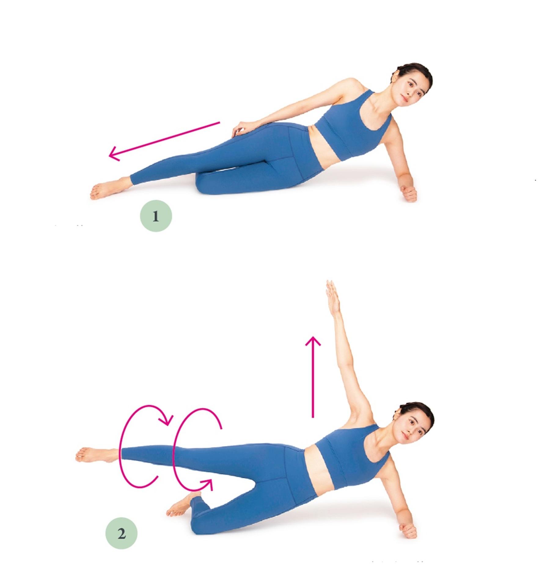 2、左ひじと左脚で体を支えながらお尻を上げ、右腕を上に伸ばしてバランスをとる。右足のつま先で円を描くようにゆっくり左回り右回り3回ずつまわす。反対側も同様に。