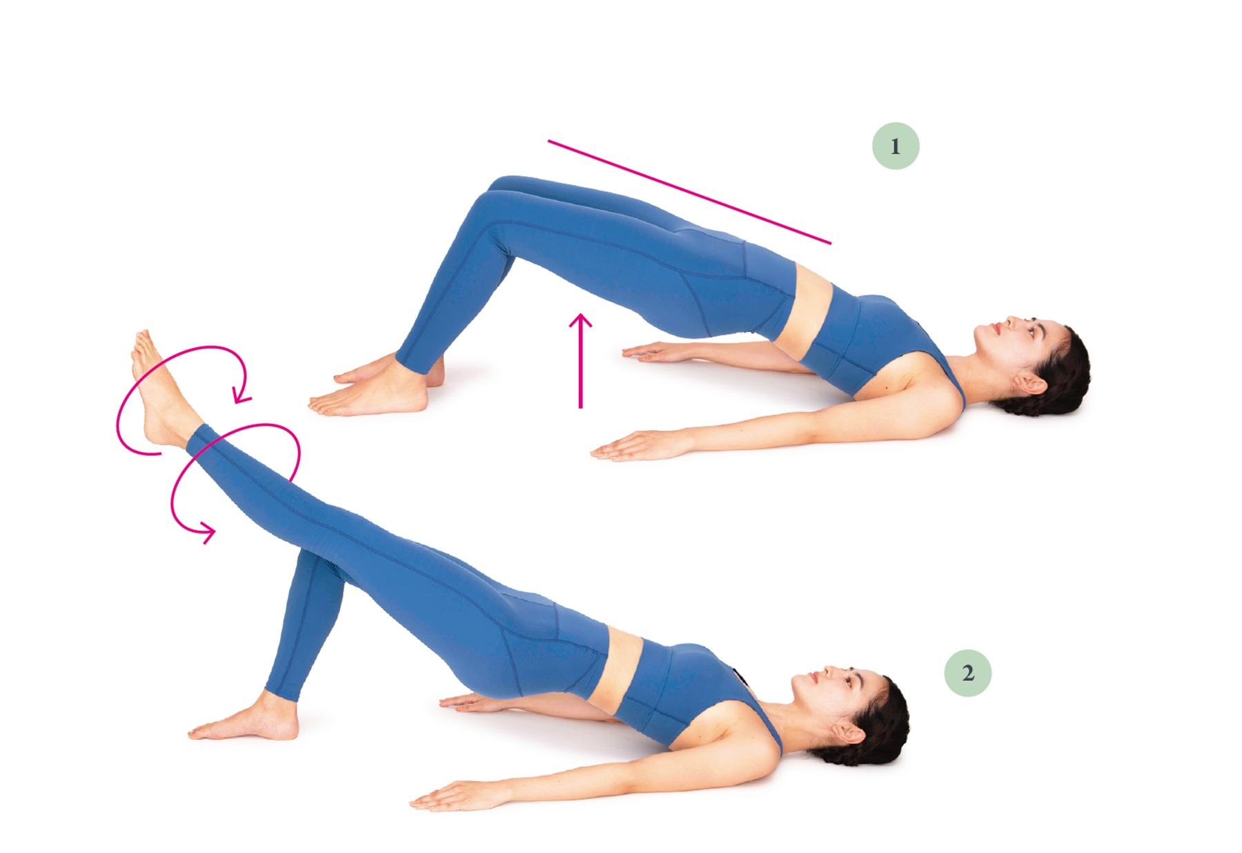 伸展に関わる大臀筋と太もも裏のハムストリングを鍛えつつ、骨盤底筋などのインナーマッスルも刺激。つま先で円を描く動きは股関節をなめらかにして可動域を広げる効果も。