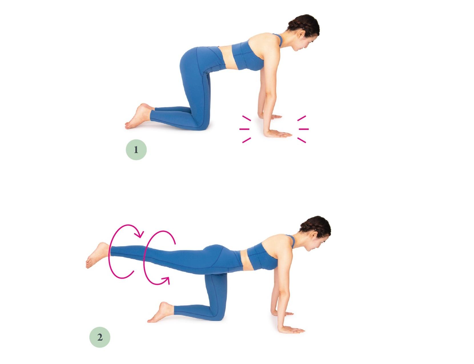 ひじとひざで体を支えて体幹を鍛え、脚を外側に開いて回す動きで、外転筋群の中臀筋や小臀筋を強化。脚を回すのがむずかしければ、2の姿勢をキープするだけでもOK。