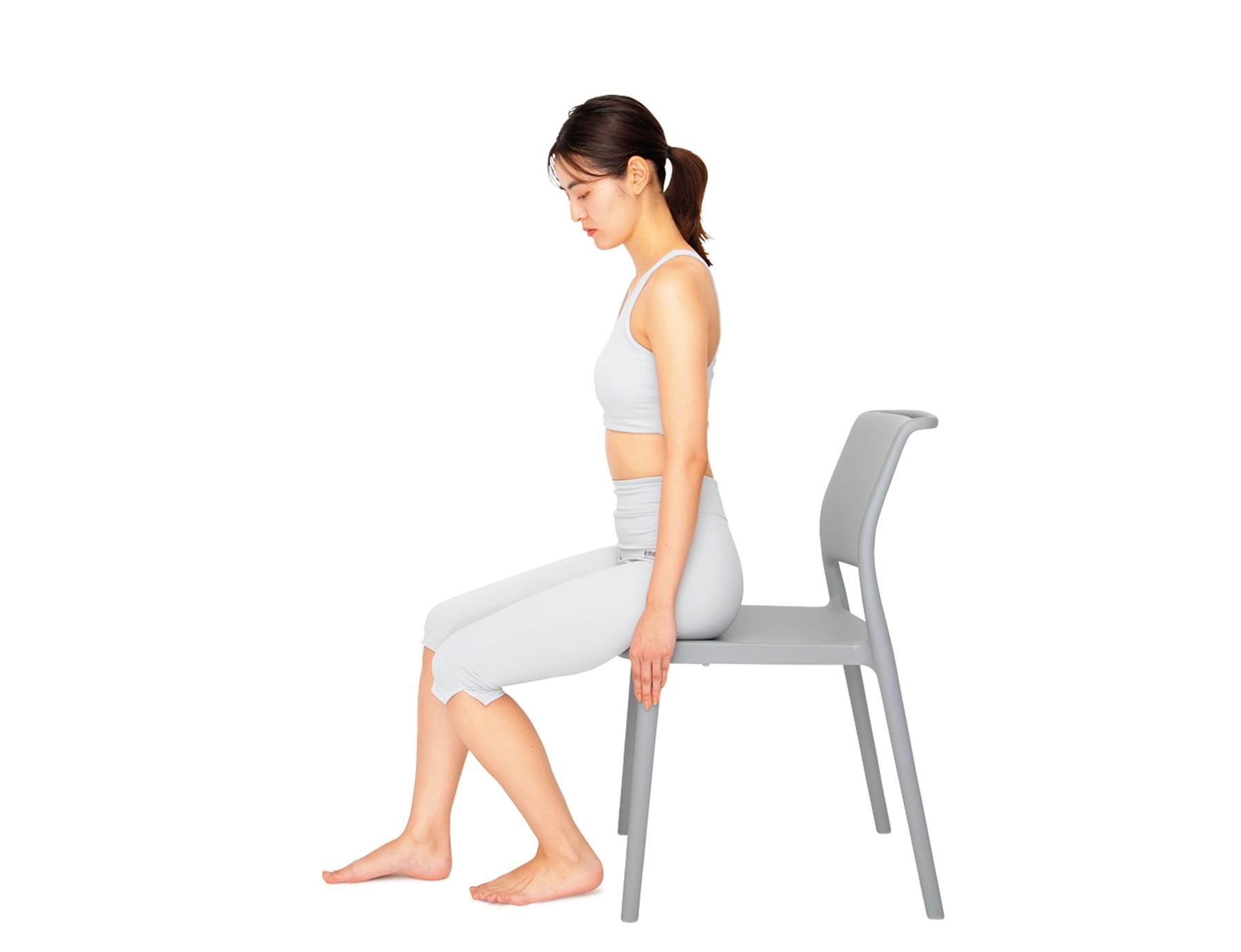 背もたれに寄りかからず、浅い位置に座る。骨盤が後ろに倒れて腰が丸まると足首の動きにも影響が出るため、骨盤を立てて、肩の力を抜いてリラックスした状態を保つことが大切。
