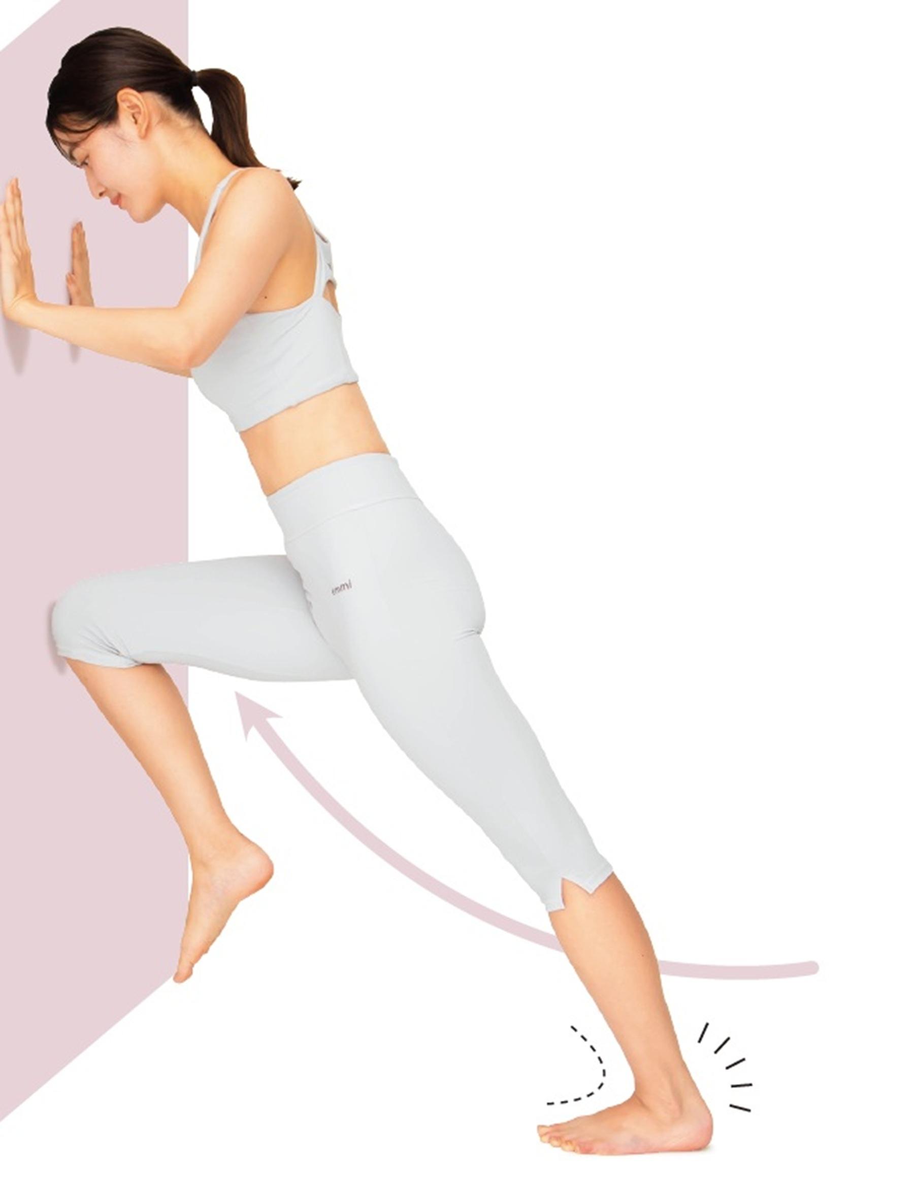 (2)両手で壁をしっかり押しながら右膝を壁に近づけ、左膝を伸ばして左足首を背屈させて5秒キープ。(1)と(2)を3回繰り返し、反対の足も同様に行う。