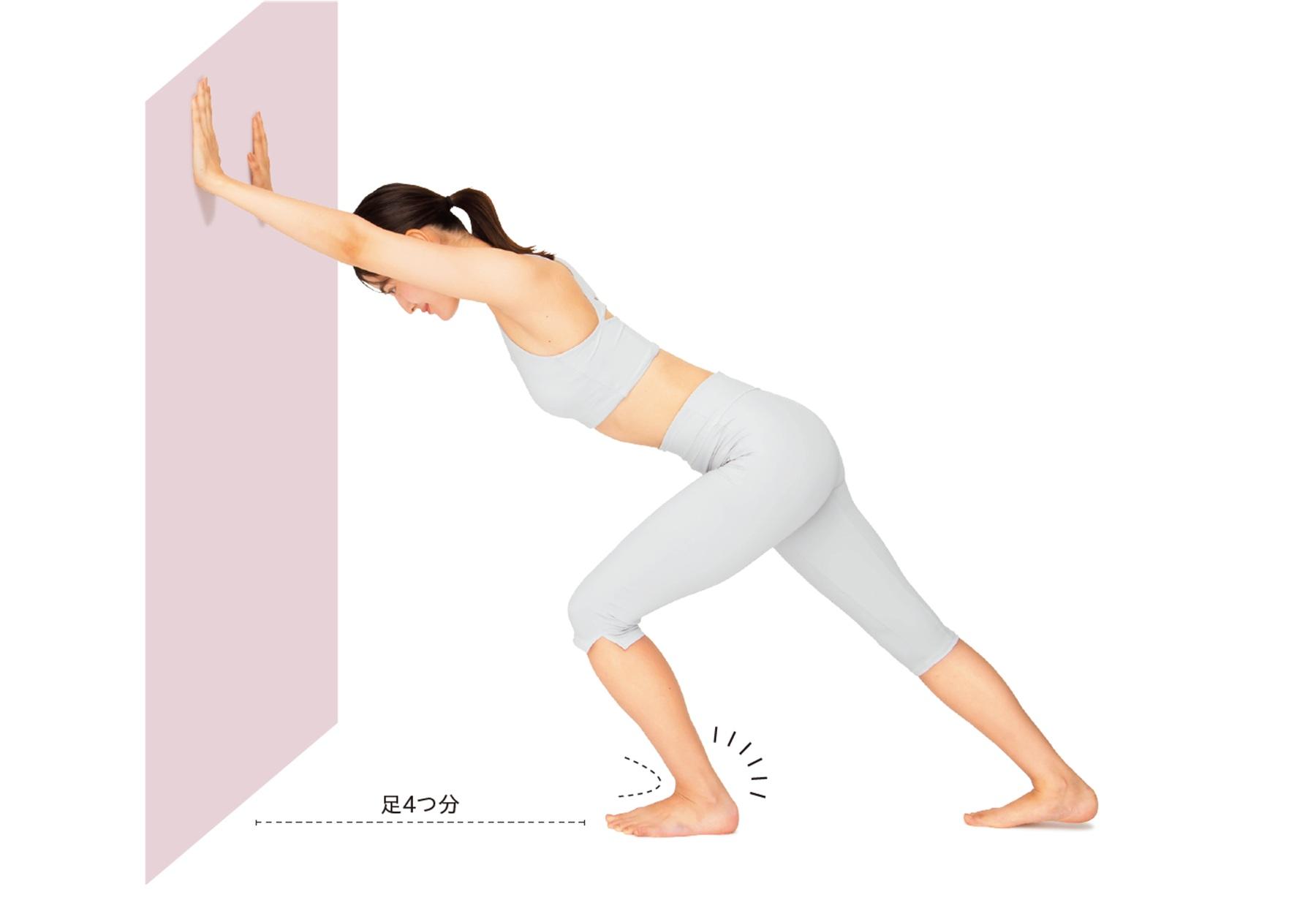 (1)壁から足4つ分離れた位置に左足を置き、壁に両手をついて右脚を後ろに伸ばす。左足のかかとを床から離さずに左膝を曲げて両足首を背屈させ5秒キープ。