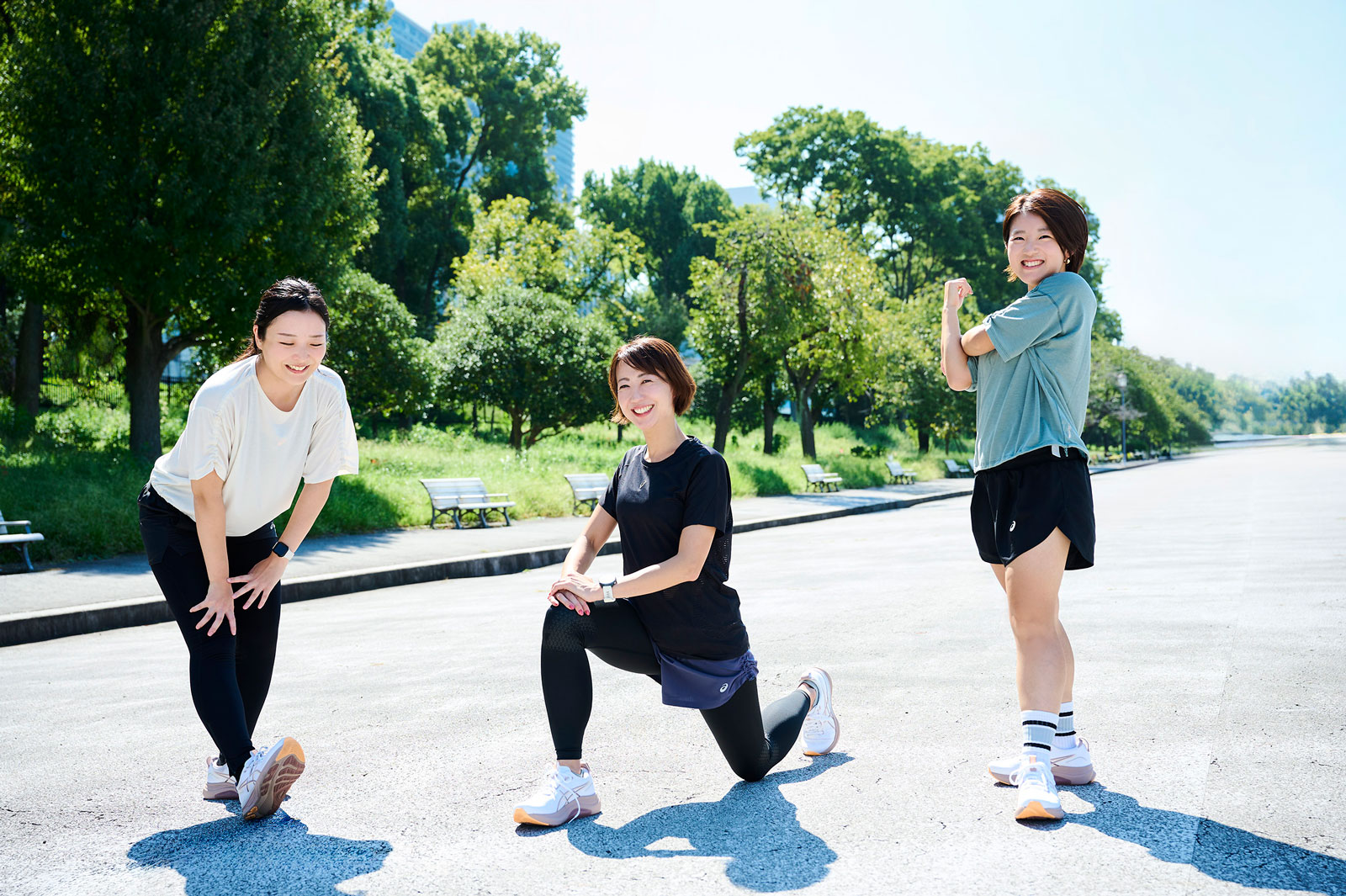 プログラム参加メンバーの片桐彩香さん(右)と、ゆかさん(左)のランニングフォームを、池田美穂コーチ(中)がチェック!まずは準備体操から。