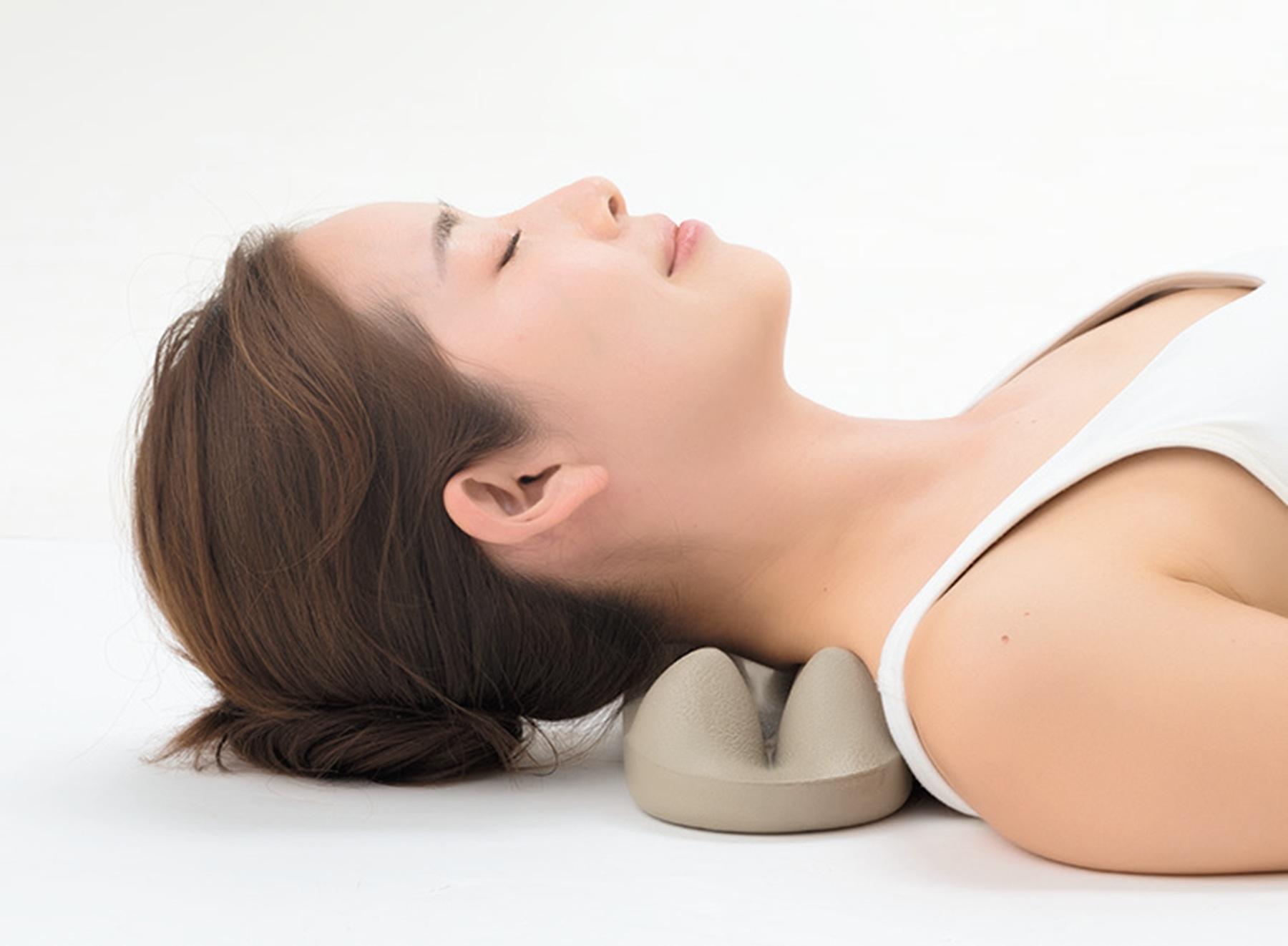 頭だけでなく、気になるパーツにも。首の付け根に当てて、仰向けに寝るだけで首や肩のコリをじんわりとほぐせる。