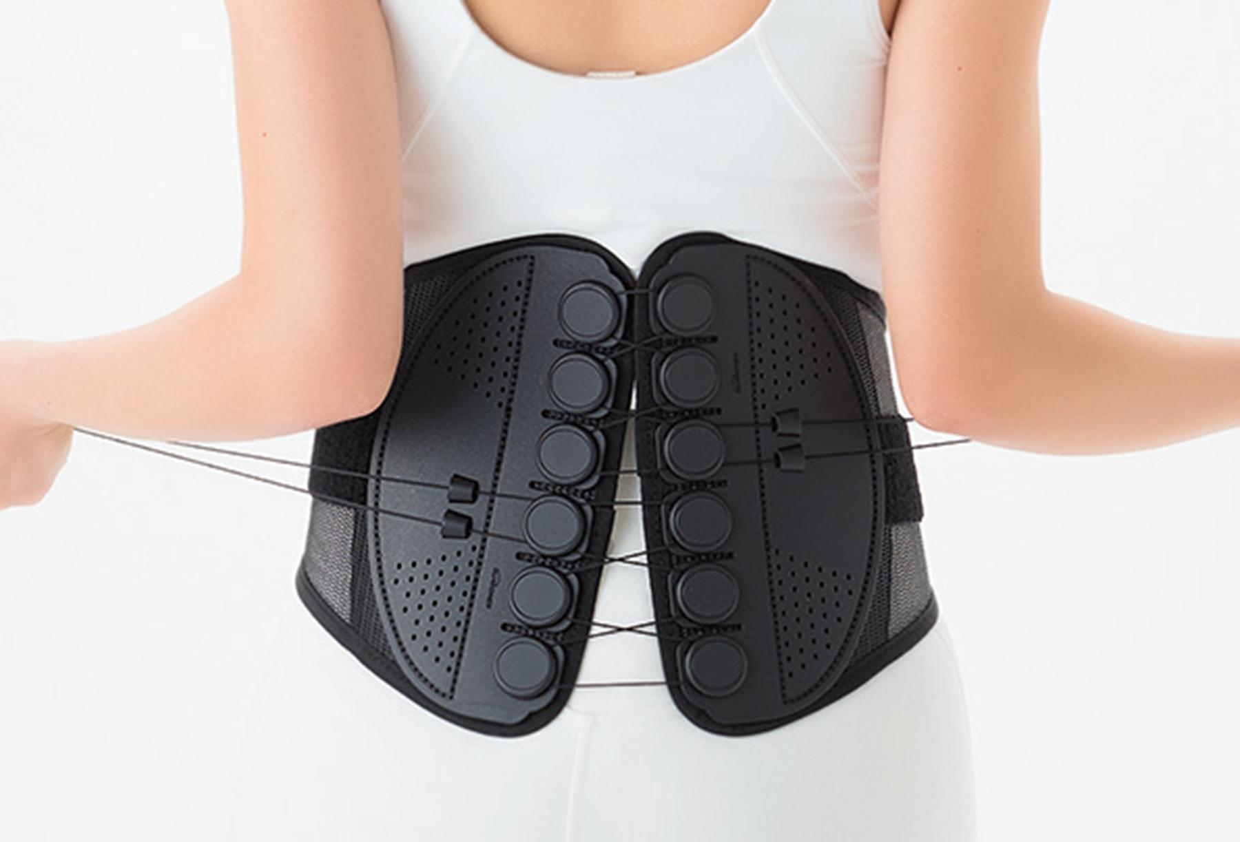 見た目はとても軽いコルセット。腰やお尻、お腹まわりなどにベルトを巻きつけたら、ギューッと紐を引いて締めつけるだけ。骨盤がグッと立ち上がり、理想の姿勢をサポートします。デスクワーク中はお腹まわりに巻き、腰の負担を軽減。骨盤全体に巻いて、10秒足上げを行えば、骨盤の歪みが整います。