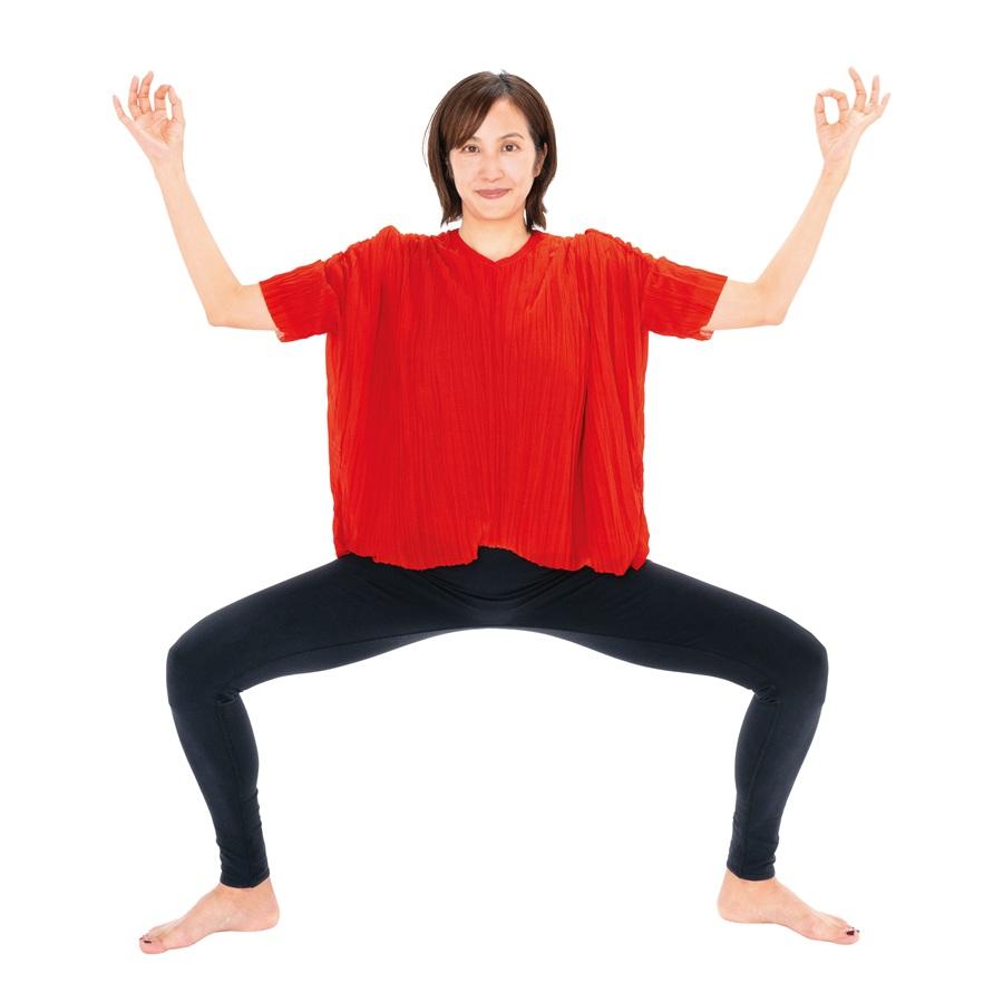 前かがみの姿勢はストレスホルモンが出やすくなる、という海外の研究報告もあるほど。自然と胸が開く、自信に満ちた女神のポーズで全身の巡りが改善し、前向きな気分が復活。またスクワットの体勢で体を支える足腰が安定し、心の揺らぎも収まっていく。