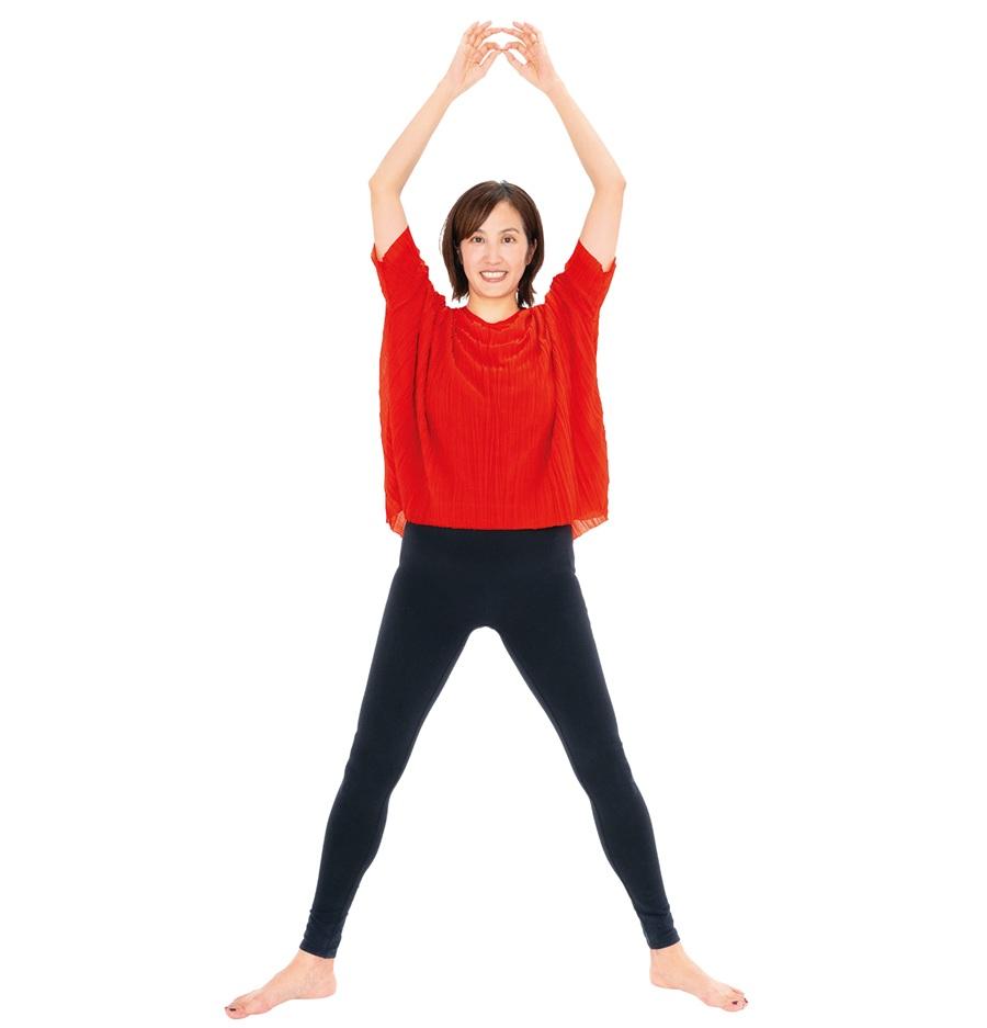 両足を肩幅より広めに開き、つま先は45度外向きに。下腹部を引き上げて。人差し指と親指で輪を作り、息を吸いながら頭上で両手の輪を近づける。肘は伸ばしても緩めてもOK。