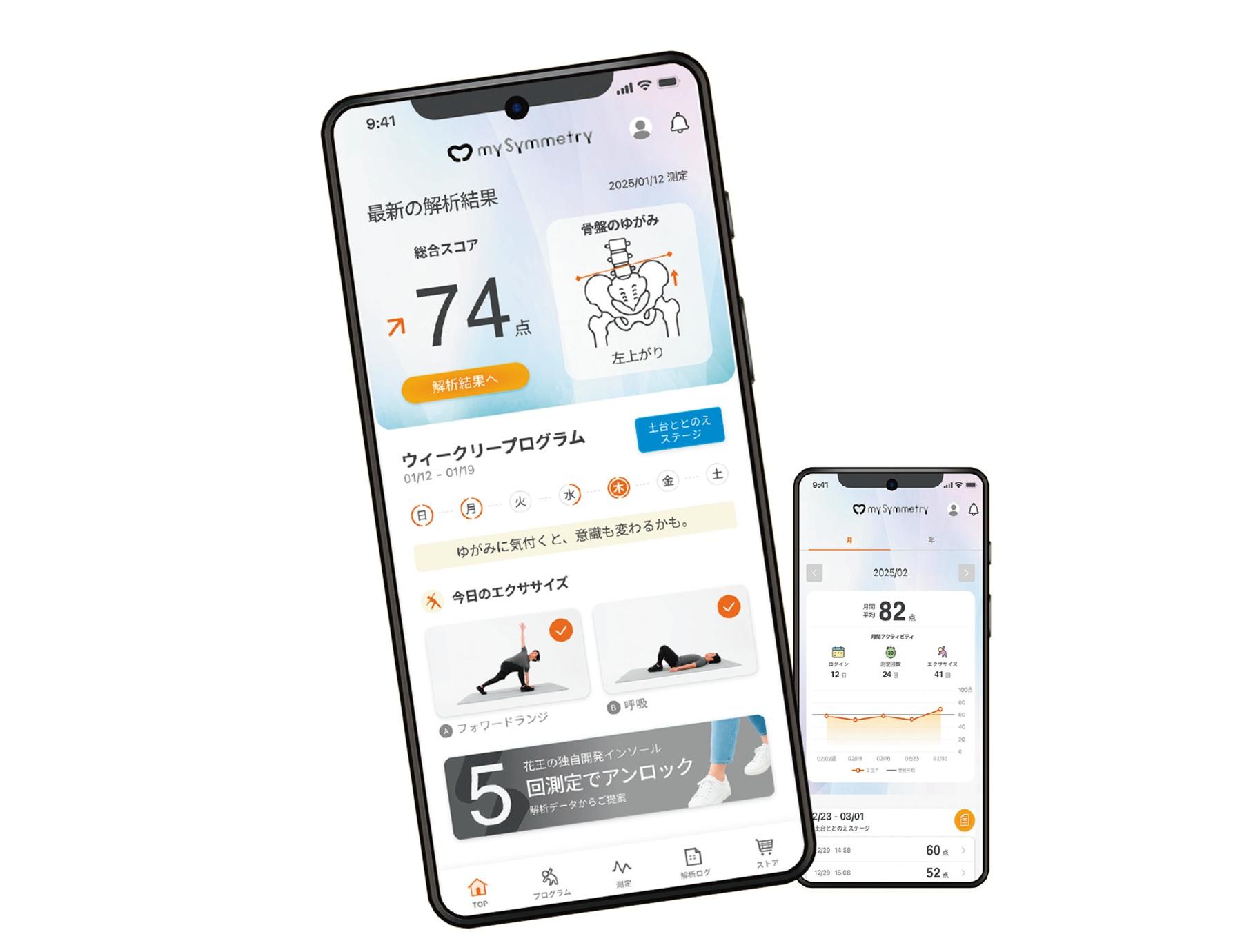 花王独自の解析技術とスマホの加速度測定機能を活用したアプリ。スマホをおへその下に当てて8歩歩くことで、姿勢の歪みを測定できる。傾きや左右差など全6項目をスコア化。結果をもとに、簡単にできる300種のエクササイズから必要な2種類を提案。さらに、おすすめしてくれたインソールを、アプリ内のリンク先「My Kao Mall」で購入することもできる。iOS/Android 無料(花王ライフケア研究所 TEL. 0120-042-134)