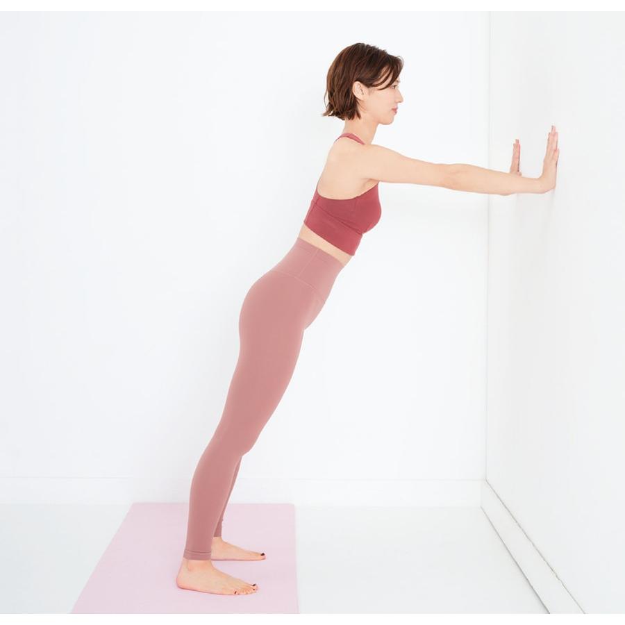 2. 手で壁を押して肘を伸ばす 1のポーズから、肘を伸ばして胸を壁から遠ざける。かかとは床につける。壁を使って腕立て伏せをしているような要領で行って。