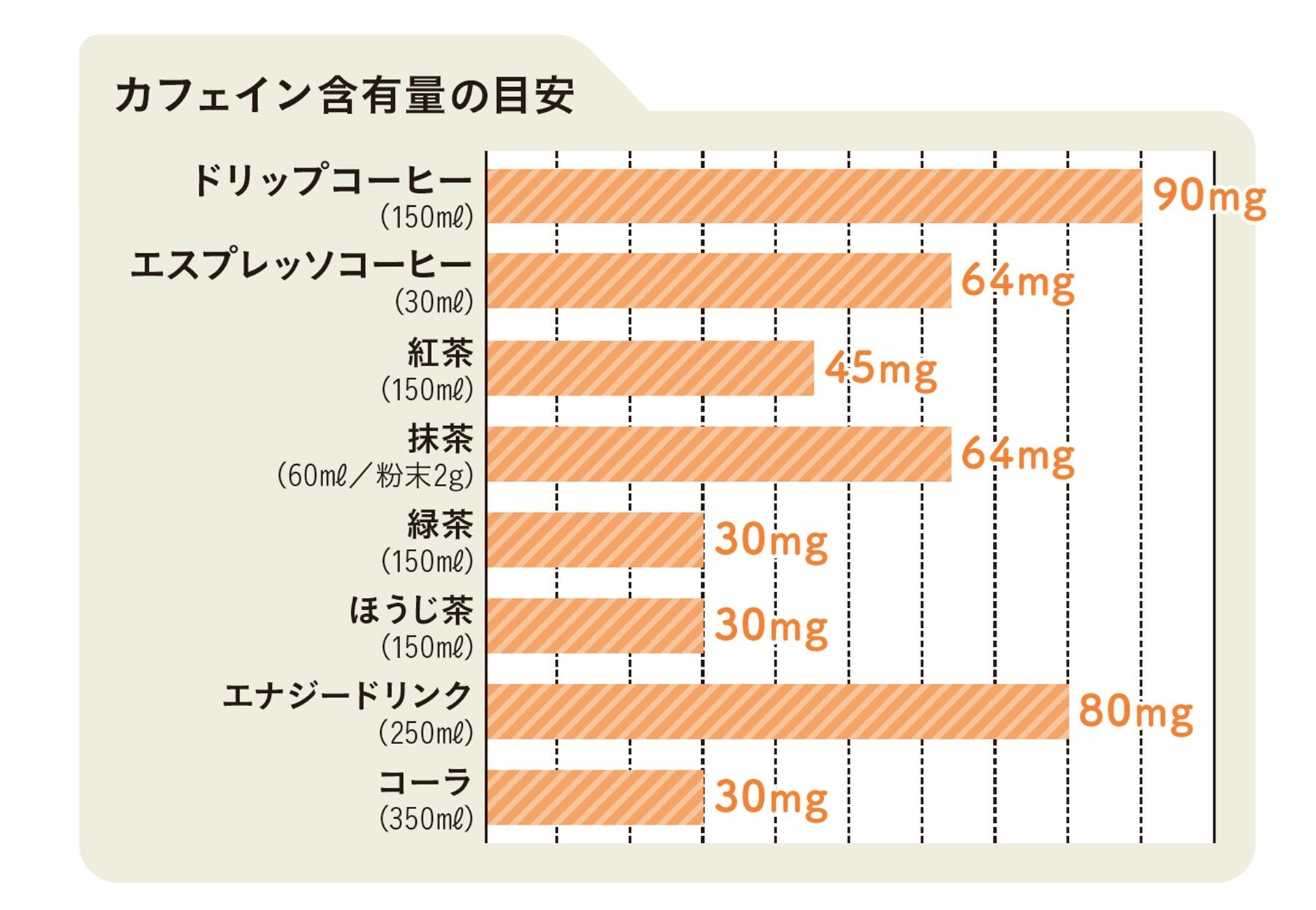 (出典元)「日本食品標準成分表(八訂)増補2023年」(文部科化学賞)、エナジードリンクは「市販4製品の成分表示等」(2017年、一般社団法人全国清涼飲料工業会)、ドリップコーヒーとエスプレッソコーヒーは米国農務省(USDA)