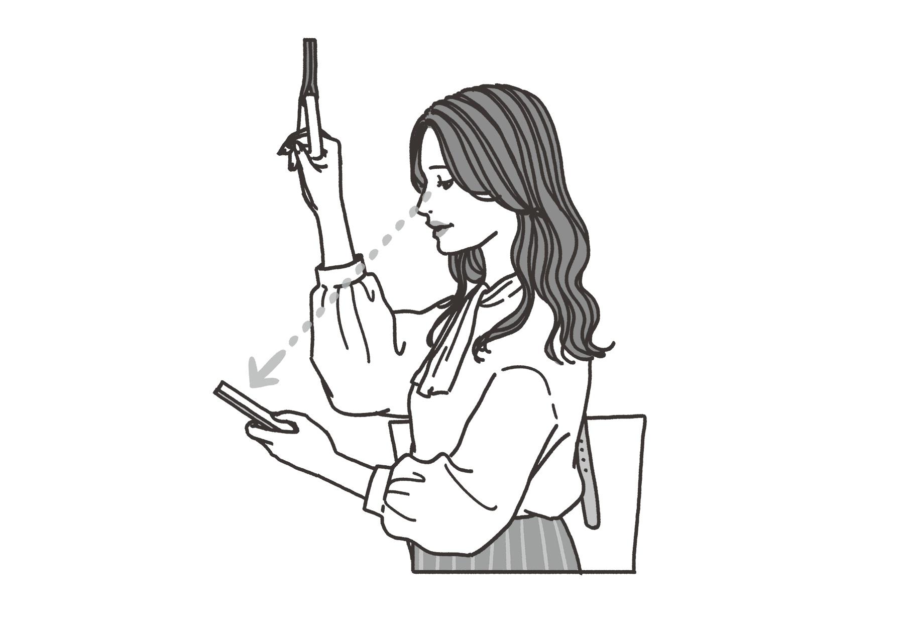 スマホと目の距離が近ければ近いほど、毛様体筋への負荷は大きくなる。「スマホを見る時は、肘を直角に曲げて見るぐらいの距離がベスト。また一点に視線が固定されると、毛様体筋が凝り固まりスマホ老眼の症状が強まるため、視線をこまめに動かすことも大切です」。さらに目が乾いているとピントが合いにくくなり、無理矢理ピントを合わせようとして毛様体筋に負荷をかけてしまうため、まばたきも意識して。