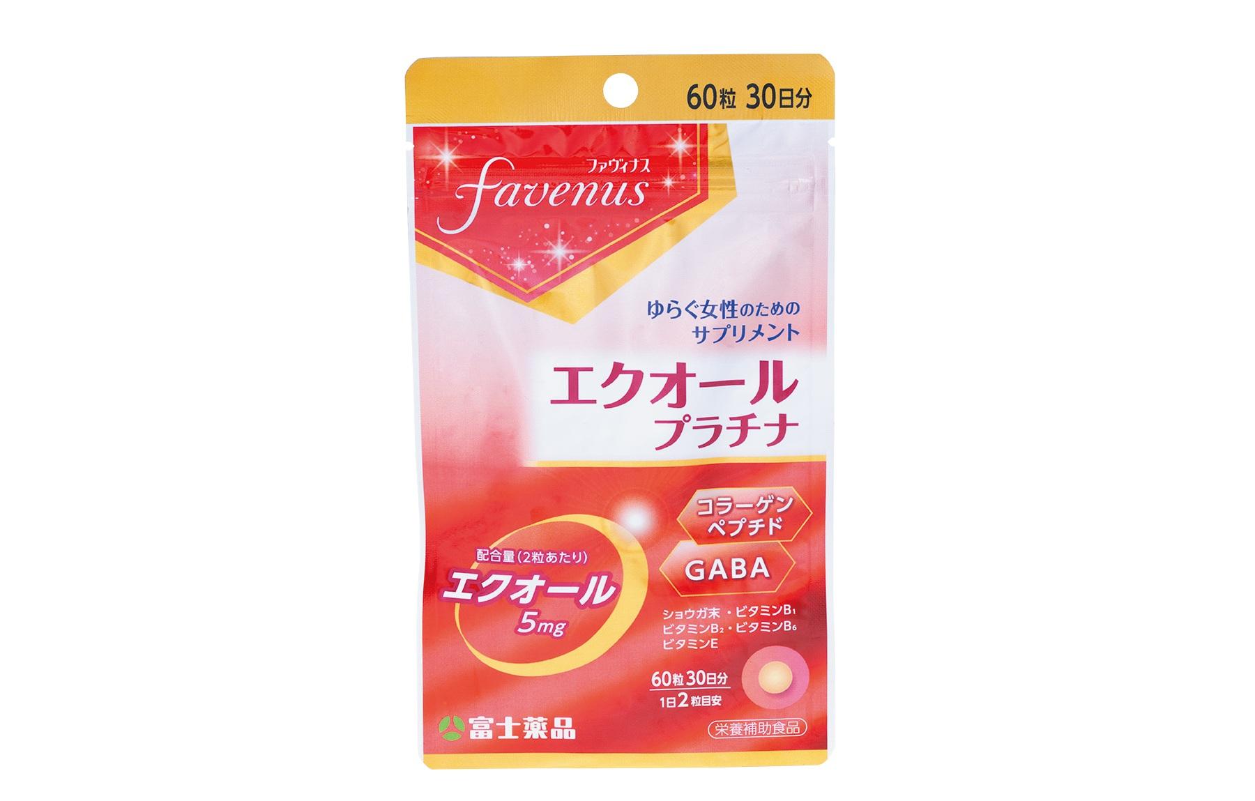 女性ホルモンに似た働きを持つ成分のエクオールのほか、コラーゲンペプチド、GABA、ビタミンB群など、働き盛りの女性に必要な栄養素をまとめて摂取できる。60粒(30日分) ¥2,678(富士薬品 TEL. 048-648-1118)