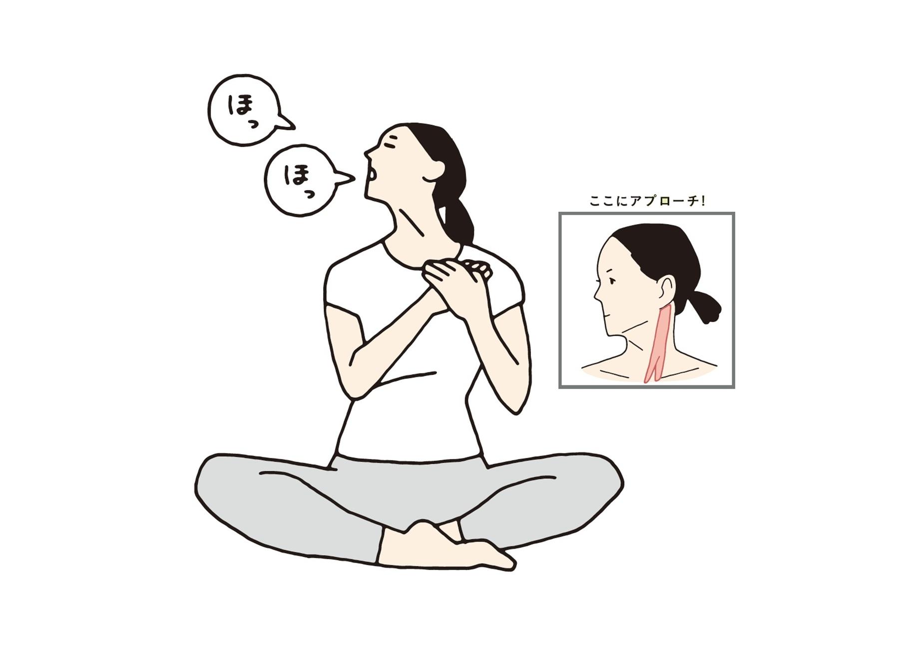 めぐらせストレッチ/片側の鎖骨に両手を重ねて置く。両手から鼻を遠くに離すように反対側の斜め上を見て、頭を後ろに倒す。首まわりを伸ばしてはゆるめるイメージでゆっさゆっさと頭をゆらして15回。伸ばすタイミングで「ほっ、ほっ」と息を吐くこと。反対側も同様にする。