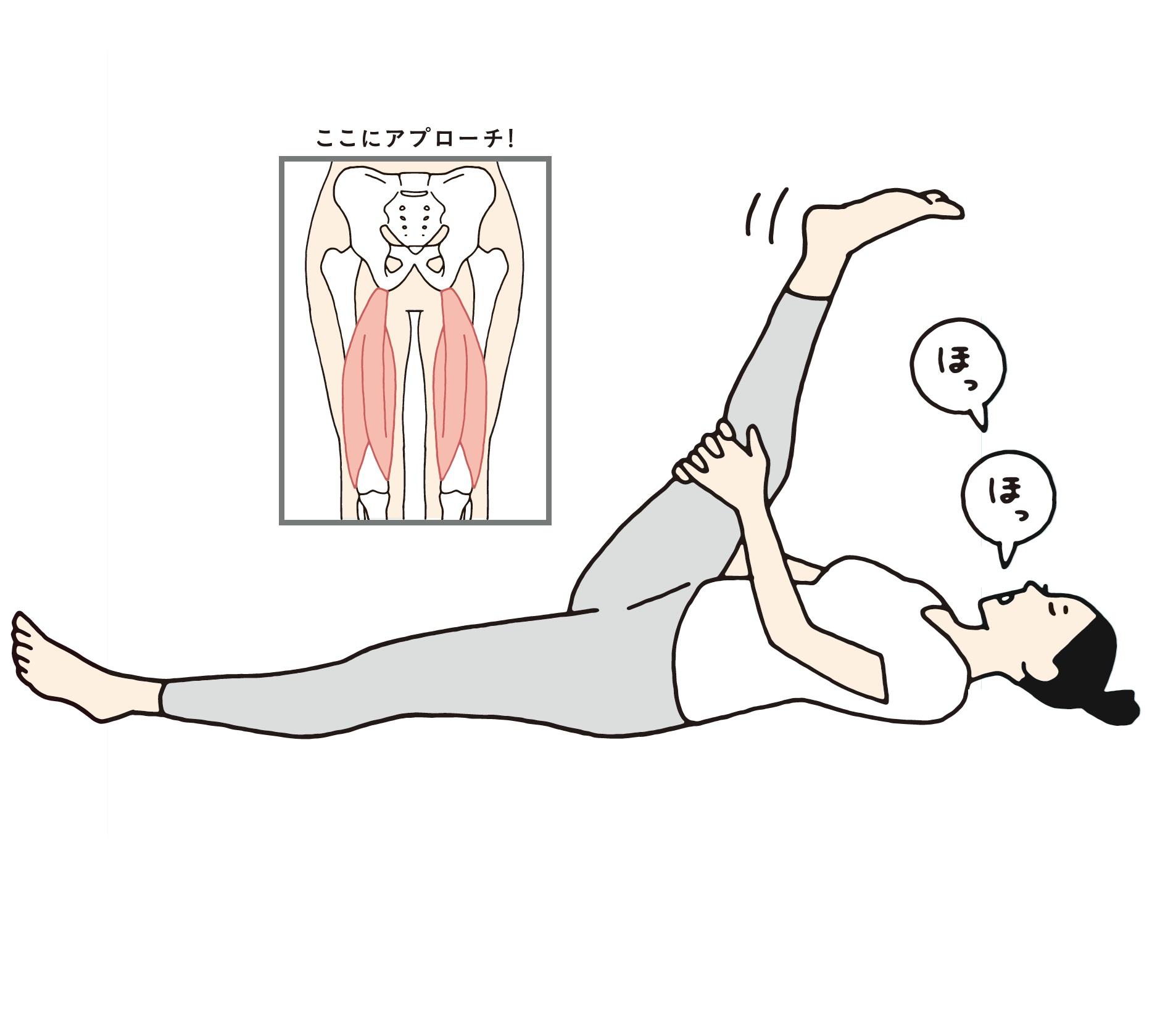「便秘や下痢に有効なツボを刺激し、もも裏を伸ばします。もも裏がゆるむと、腰部の筋肉の負担や脚のだるさが軽減します」