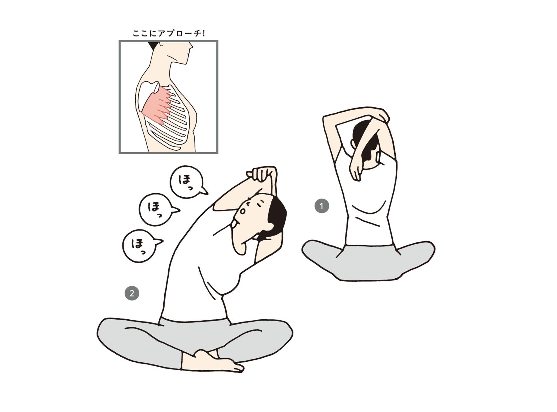 血流と精神活動の要とされる心臓の働きが弱まると、動悸や不安、無気力などの症状が。また、肺の不調は呼吸を浅くし、息切れしやすくなる。「心臓や肺に不調がある人は、みぞおち付近やわきの下にこわばりが現れます。ツボ回しでみぞおち付近をほぐすことで呼吸がしやすくなり、ストレッチでわきの下を伸ばして前鋸筋をゆるめることで、めぐりが改善されます」