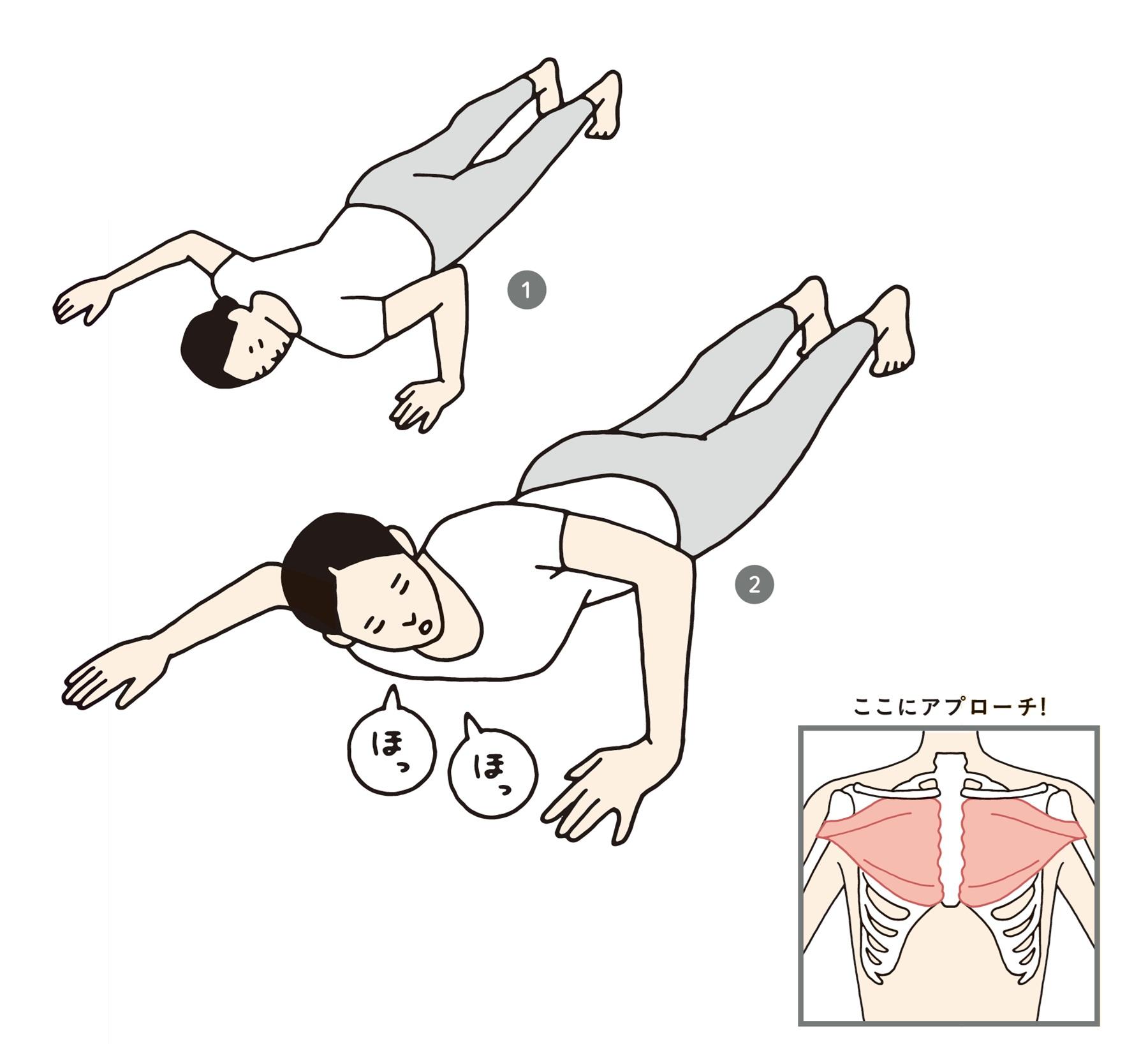 めぐらせストレッチ/① うつ伏せになり、右手は肩と同じ高さに伸ばしてから、肘を90度に曲げる。左側に顔を向け、左手は肩の横につく。② 左手で床を押しながら、体を起こす。右胸を伸ばしてはゆるめるイメージで、ゆっさゆっさと15回動かす。伸ばすタイミングで、「ほっ、ほっ」と息を吐くこと。反対側も同様にする。