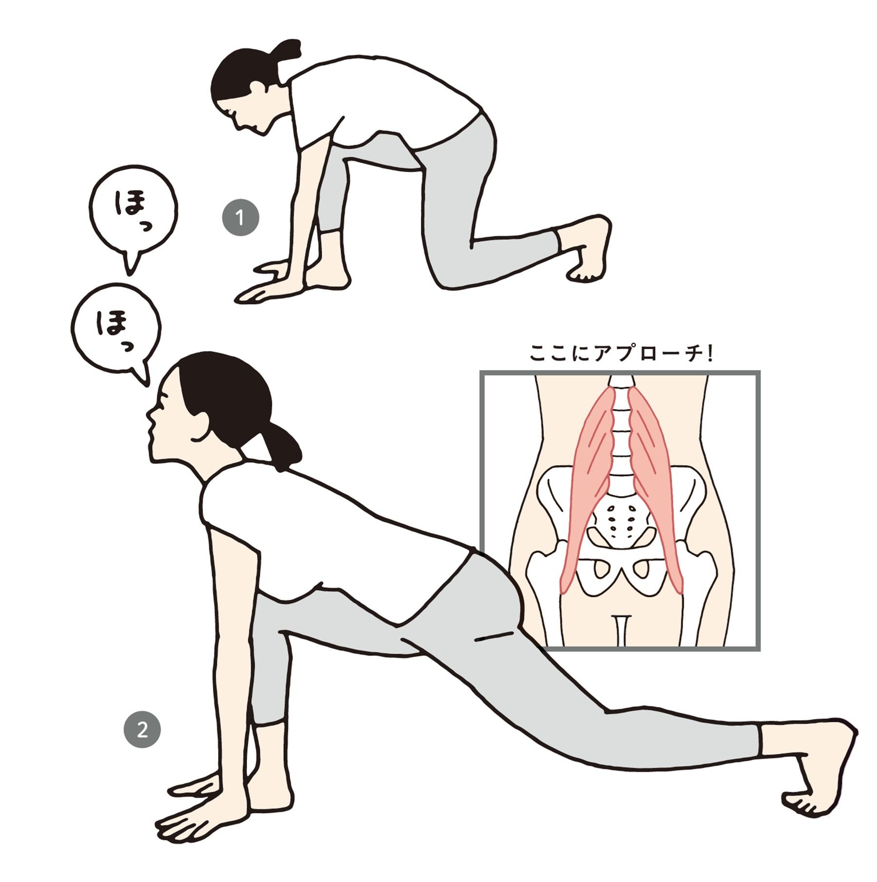めぐらせストレッチ/① 四つ這いになり、左膝は股関節の下にくるようにし、手は肩幅より広めに床につける。右膝を真っすぐ前に出して立てる。② 左足を後ろに引き、おへそを床に近づけて脚の付け根を伸ばす。伸ばしてはゆるめるイメージでゆっさゆっさと15回動かす。伸ばすタイミングで「ほっ、ほっ」と息を吐くこと。反対側も同様にする。