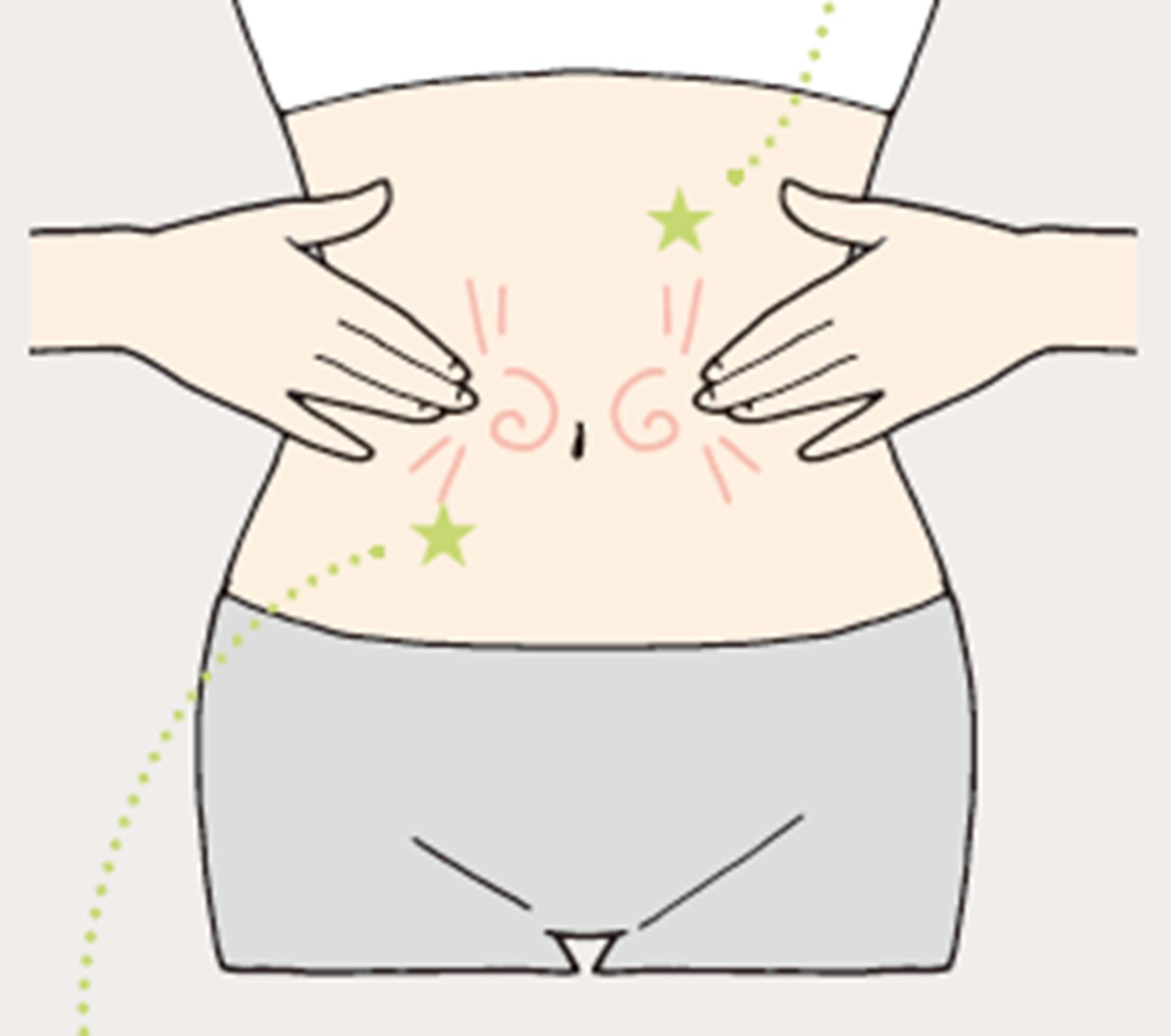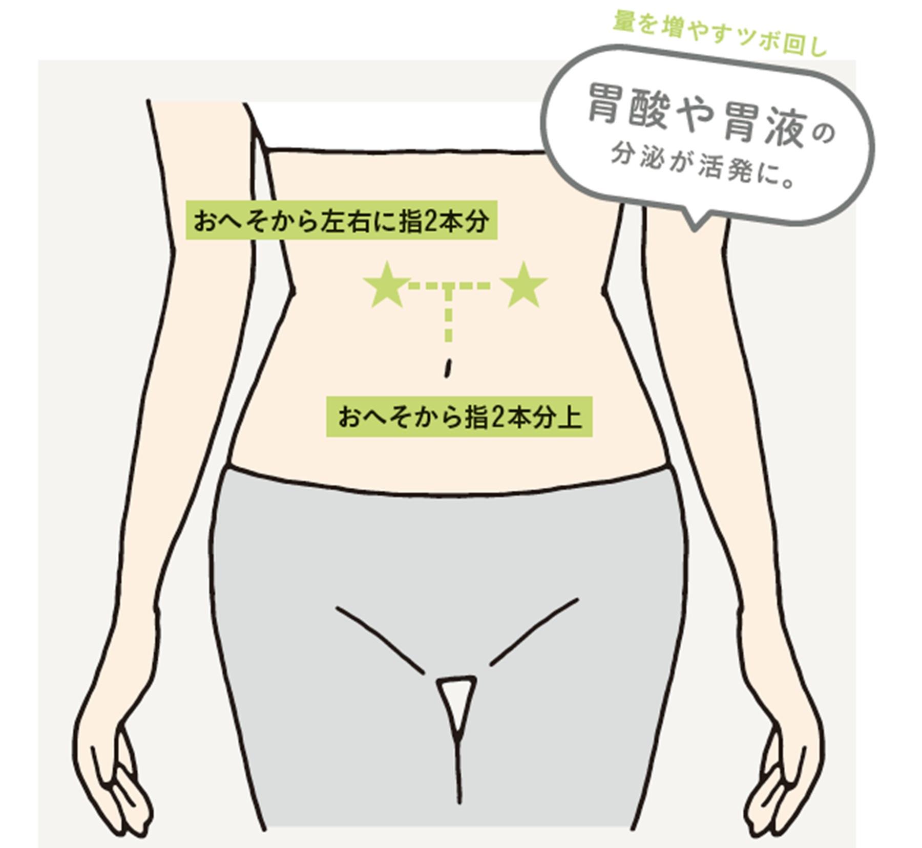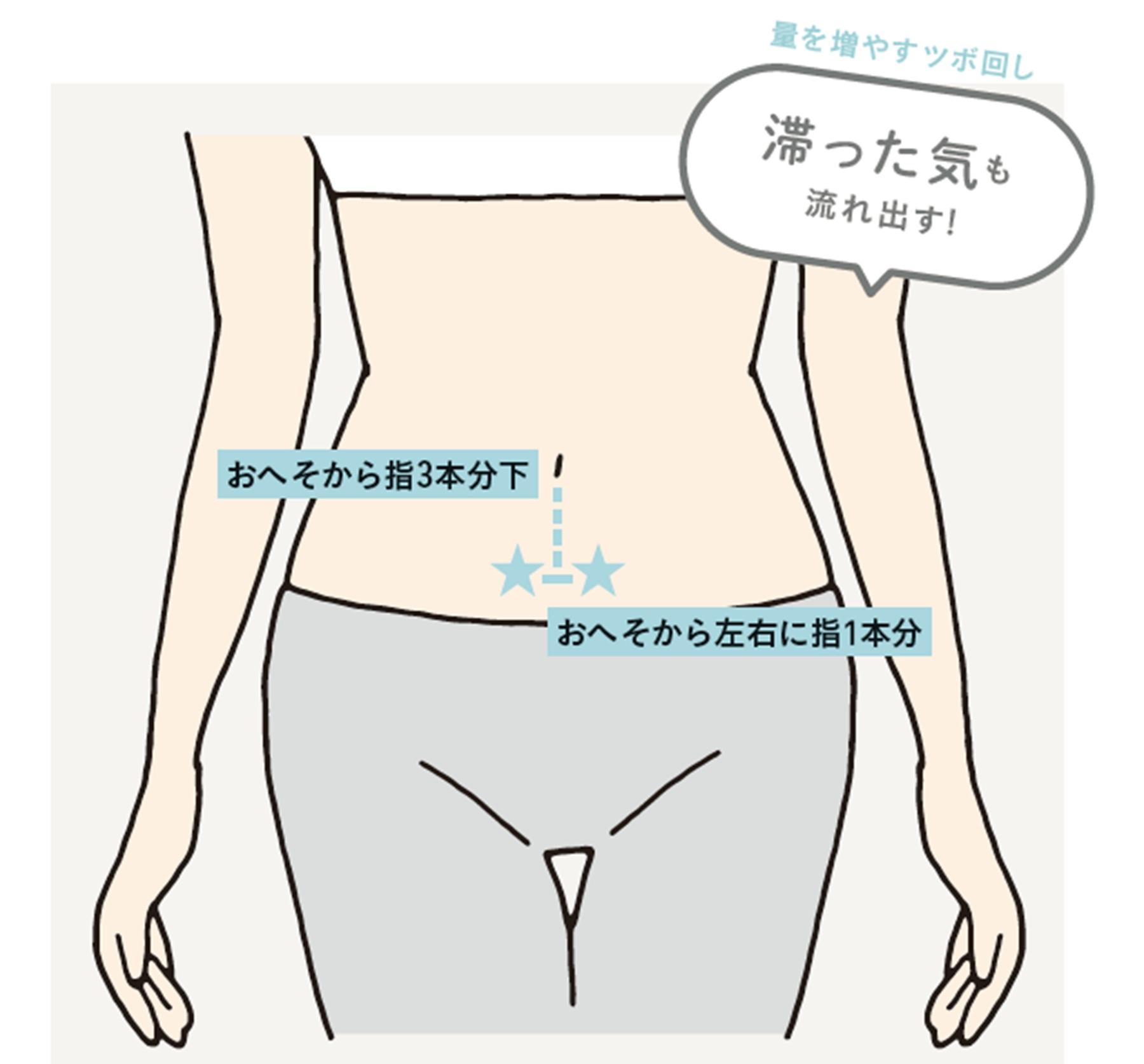 量を増やすツボ回し/おへそから指3本分下、そこから左右に指1本分の場所。ツボに左右の手の中指を当て、抵抗を感じるくらいの深さ(3~6cmくらい)まで押し込み、10円玉大の円を描くように30回転マッサージする。
