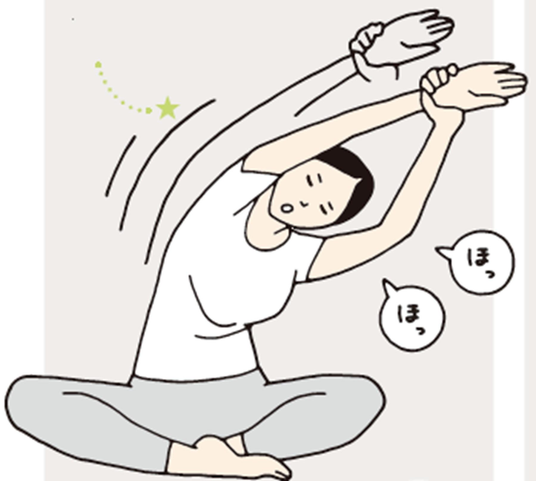 「ほっ、ほっ」という呼吸に合わせてゆっさゆっさとゆらし伸ばす。※お風呂上がりや夜がおすすめ。(目安:左右各15回)