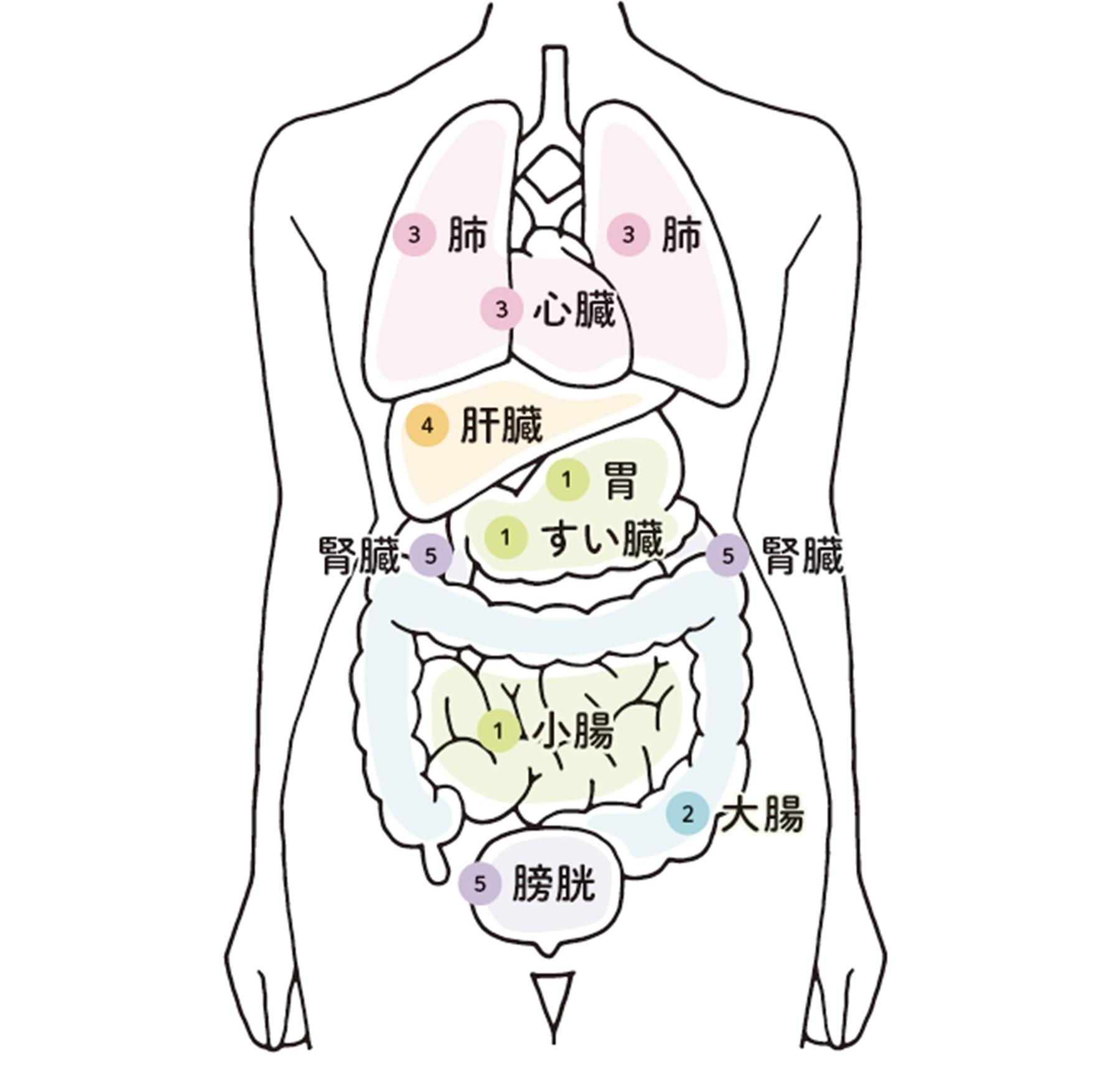 ① 胃グループ(胃、すい臓、小腸)、② 大腸グループ、③ 心臓グループ(心臓、肺)、④ 肝臓グループ、⑤ 腎臓グループ(腎臓、膀胱)