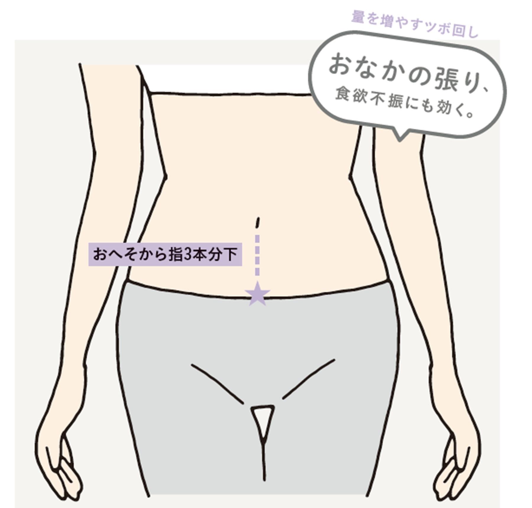 量を増やすツボ回し/おへそから指3本分下の場所。ツボに両手の中指を当て、抵抗を感じるくらいの深さ(3~6cmくらい)まで押し込み、10円玉大の円を描くように30回転マッサージする。
