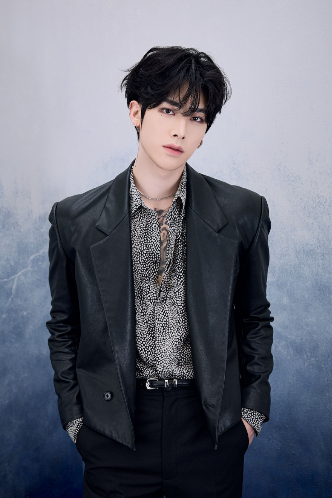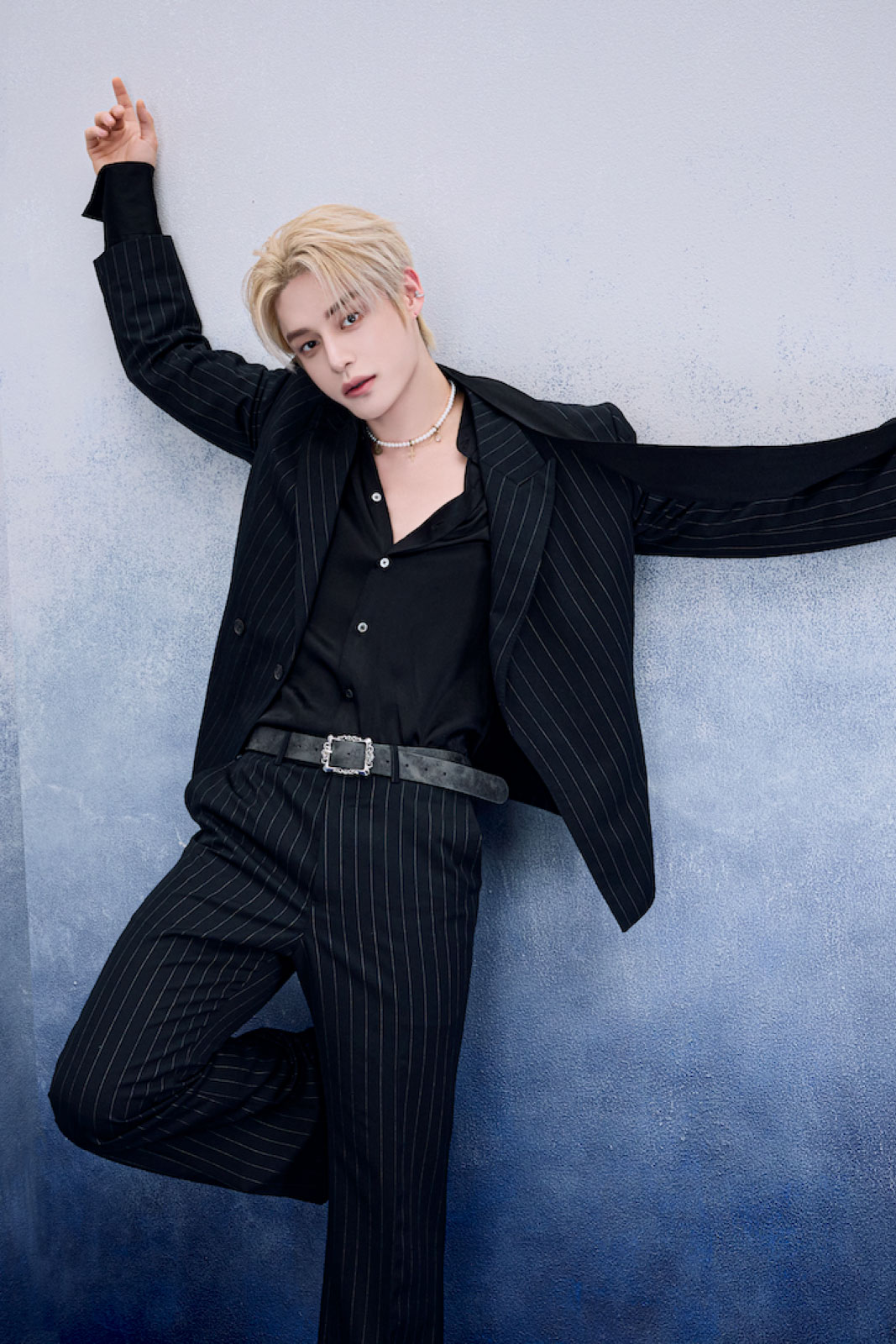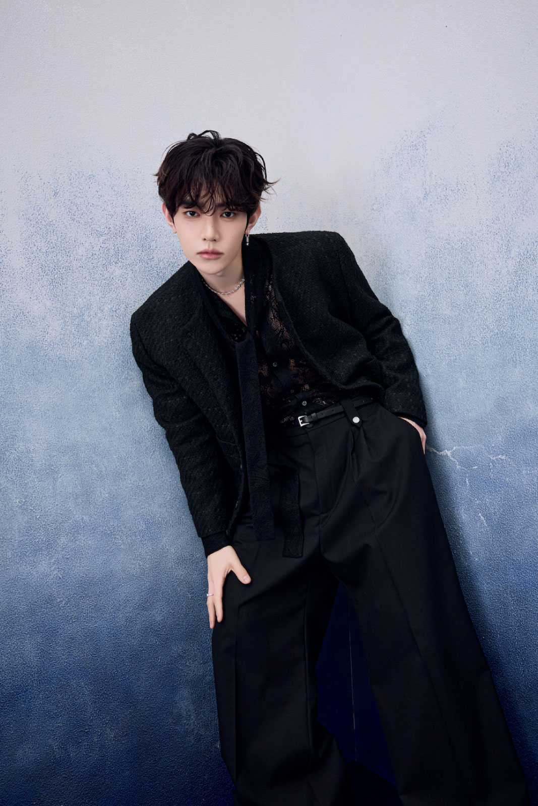 ソン・ハンビンさん ジャケット ¥206,800(アレキサンダーワン TEL.03-6418-5174) パンツ ¥44,000(ガラアーベント/サーディヴィジョンピーアール TEL.03-6427-9087) ブーツ ¥44,000(カンペール/カンペールジャパン TEL.03-5412-1844) ネックレス ¥4,400(ライオンハート/シアンピーアール TEL.03-6662-5525) ブレスレット ¥37,400(オーキ/ロードス TEL.03-6416-1995) その他はスタイリスト私物